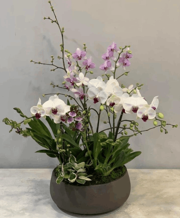 A luxurious arrangement of white and purple orchids, adding elegance and exotic charm as a gift or centerpiece.