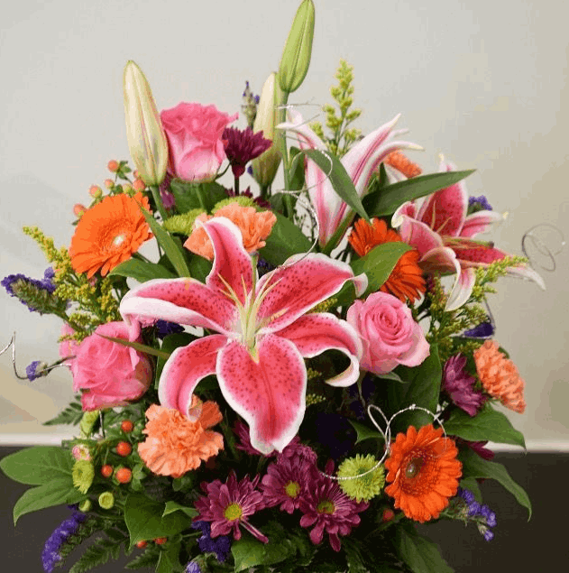 Rich orange and pink lilies gathered in a bouquet that radiates beauty and grace for celebratory gifts.