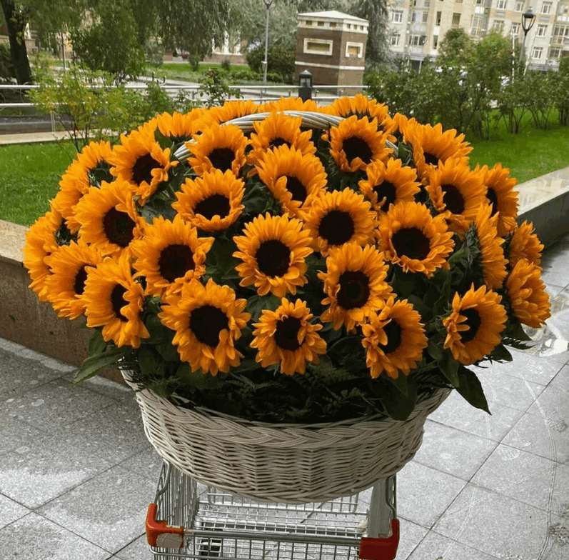 Radiant sunflowers paired with greenery in a basket to brighten any space cheerfully.
